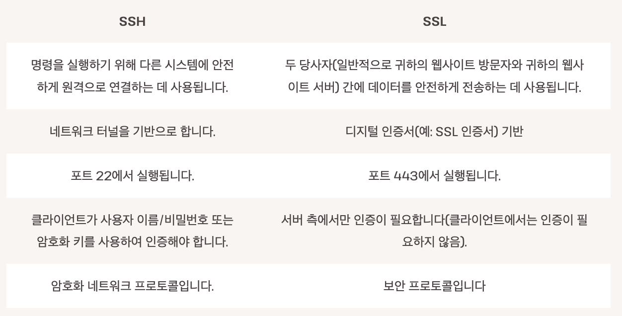 SSL과 SSH의 기술적 차이점은 아래 표로 대체합니다. (첫 번째 참고 링크에 더 자세한 내용이 담겨 있습니다.)