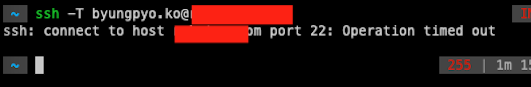 에러의 원인은 아래 터미널에서 볼 수 있듯이 SSH는 보통 22번 포트를 사용하는데 계정 설정 과정에서 권한이 빠져버리는 탓에 SSH 연결이 되지 않아 git pull은 되지만 git push가 안 되는 상황이었습니다. ('ssh -T 계정'으로 ssh 연결을 확인할 수 있습니다.)