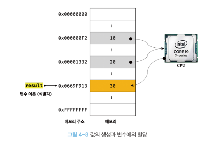 변수 선언이란 값을 저장하기 위한 메모리 공간을 확보하고, 변수 이름과 확보된 메모리 공간의 주소를 연결해서 값을 저장할 수 있게 준비하는 것을 의미한다.