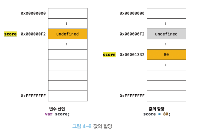 변수 이름을 등록하고 값을 저장할 메모리 공간을 확보. undefined 값이 암묵적으로 할당되어 초기화된다.