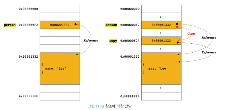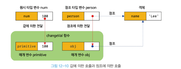 - 원시 값을 다른 변수에 할당되면 원시 값이 복사되어 전달된다.(값에 의한 전달이며 pass by value라고 함) 객체를 가리키는 변수를 다른 변수에 할당하면 원본의 참조 값이 복사되어 전달된다.(참조에 의한 전달 pass by reference)