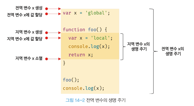전역 변수의 생명 주기는 애플리케이션의 생명 주기와 같지만, 함수 내부에서 선언된 지역 변수는 함수가 호출되면 생성되고 함수가 종료하면 소멸한다.