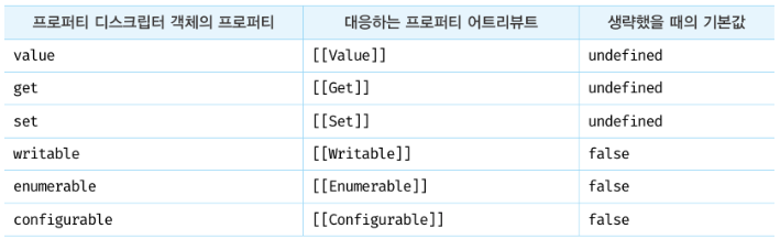 자바스크립트 엔진은 프로퍼티를 생성할 때 프로퍼티의 상태를 나타내는 프로퍼티 어트리뷰트를 기본값으로 자동 정의한다.
