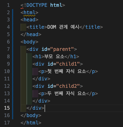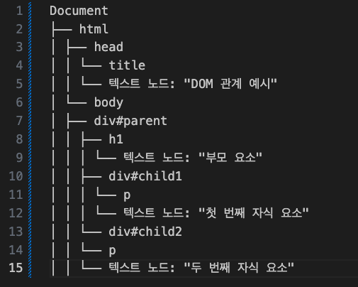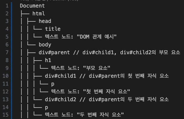 - 트리 구조: DOM은 문서의 요소들을 트리 형태로 표현하며, 각각의 노드는 문서의 각 요소(HTML 태그, 속성, 텍스트 등)를 나타냅니다. 예를 들어, <html> 태그는 가장 최상위 노드이며, 그 아래에 <head>와 <body> 같은 자식 노드들이 있습니다.